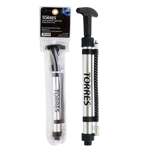 Насос двойного действия "TORRES", длина 20 см, корпус из высокопрочного и легкого алюминиевого сплава, в комплекте игла с диаметром резьбы 5 мм для накачивания мячей (в ручке насоса) и гибкий шланг.